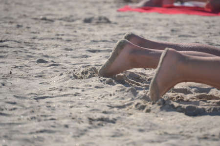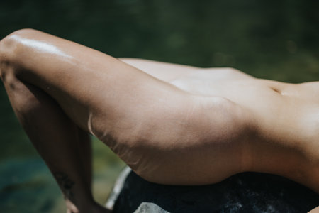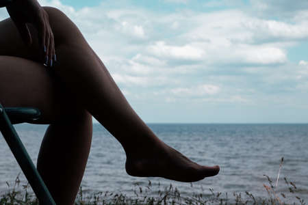Close-up of a womans tanned legs relaxing outdoors in the sun by water