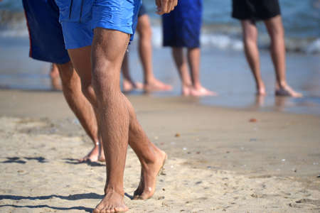 Close-up picture of teenagers' legs in colorful swimsuits on the ocean background. A group of four young friends walking near the sunny, light blue sea. Summer recreation and fun concept.
