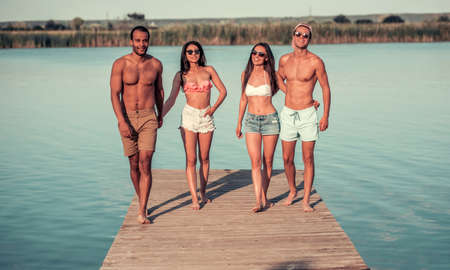 Happy friends are looking at camera and smiling while walking along the pier at the sea