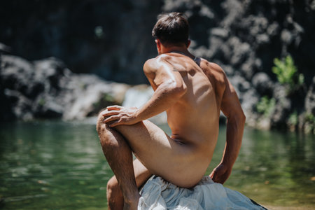 Rear view of a naked man enjoying nature at a tranquil river setting