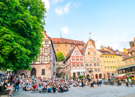 Streets of Nuremberg with traditional german houses in the background and tourists socialisisng with locals. ravel destination and tourism in Germany. Nurnberg. 23.07.2018