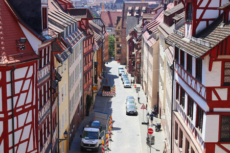 Nurnberg, Germany, May 1, 2018: Old fachwerk houses on Weissgerbergasse street in the historical center of Nuremberg