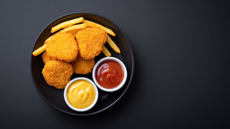 Fried crispy chicken nuggets with ketchup. Top view with copy space. Black background.
