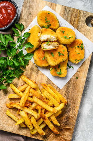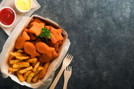 Fried Chicken Nuggets with French Fries on a Plate, top view. Overhead, from above, flat lay.