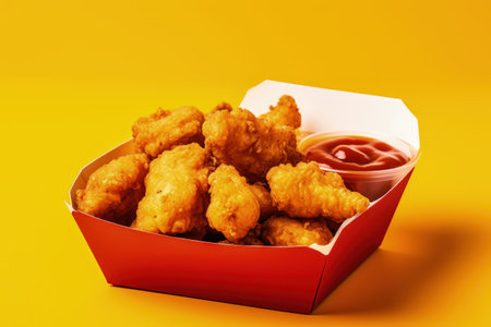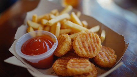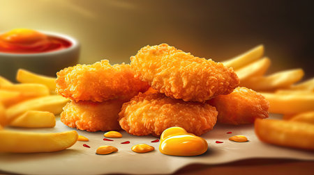 Chicken nuggets with french fries and ketchup. Crispy food background. Generative AI art