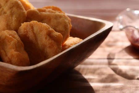 Organic Fried Chicken Nuggets on a wooden board, side view. Close-up.