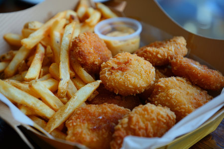Appetizing chicken nuggets and fries meal on a paper liner, served with dipping sauces, capturing the essence of a tasty fast-food experience