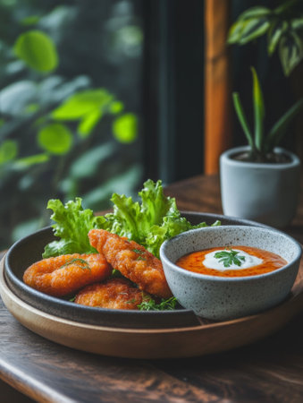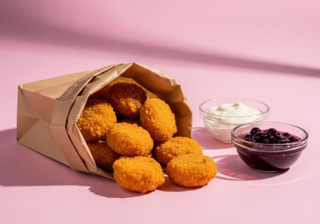 Crispy chicken nuggets served with delicious dipping sauce on a vibrant background
