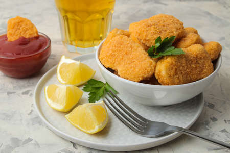 Chicken nuggets in a bowl with red sauce, ketchup and beer on a light concrete table. fast food.