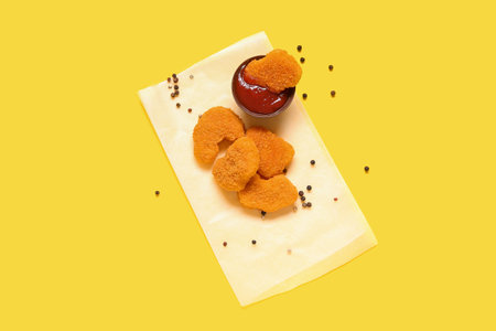 Baking paper with tasty nuggets and bowl of ketchup on yellow background