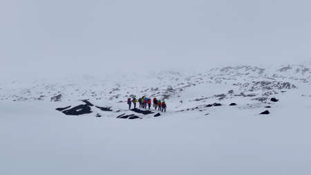 Climbers with large backpacks and trekking poles walk along the snow-covered trail. Trekking in the Klyuchevskoy volcano park. Travel to the Kamchatka Peninsula.