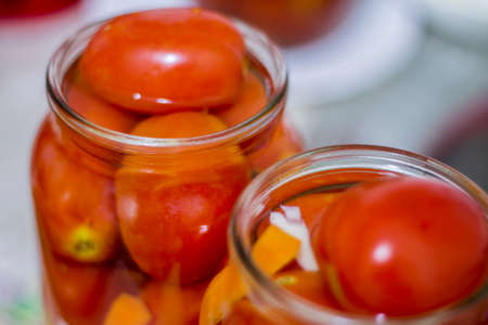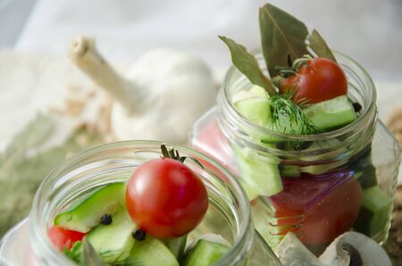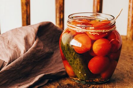fermented tomatoes in transparent glass jars . On a wooden vintage background. cucumber. textile