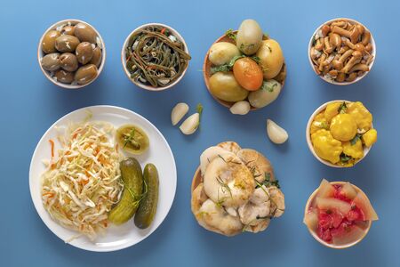 Fermented products cabbage, peppers, pickles, tomatoes, mushrooms, zucchini, garlic on a blue table. Top view