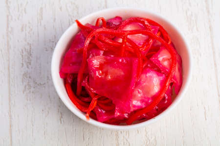 Delicious spicy pink cabbage sliced and cooked in Korean style on a ceramic plate on a dark concrete background