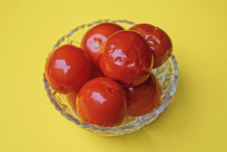 a bunch of red sour tomatoes in a glass plate stands on a yellow table