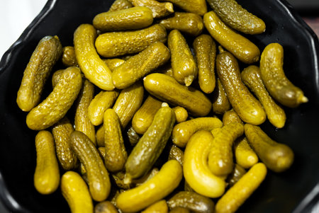 pickled whole cucumbers in a glass open jar on the kitchen table. view from above