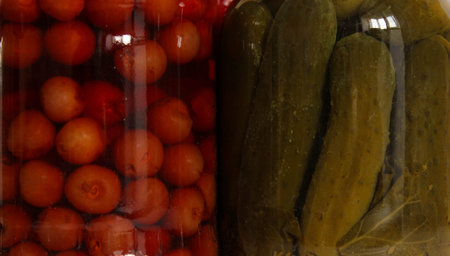 Macro crop showing red fruit compote beside packed pickled cucumbers through the glass. Rich colors and textures of homemade preserves.