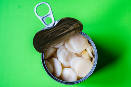 London UK, June 06 2025, Open Tin or Can Of Chinese Water Chestnuts Cooking Ingredients