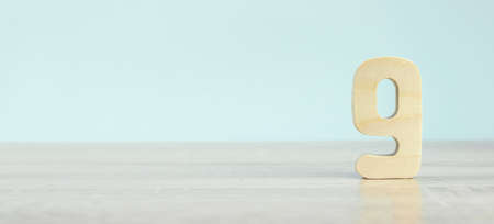 Wood Number 9 Nine On Table. Close-Up. Copy space