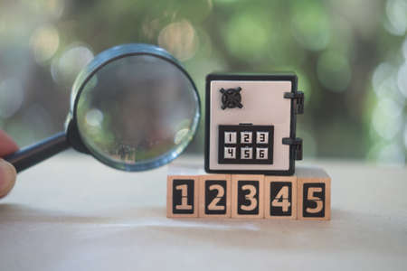 Magnifying glass with money safe box. Concept of security and protection