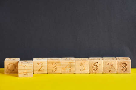 Numbers written on wooden cubes. Copy space - concept of education, child development, back to school