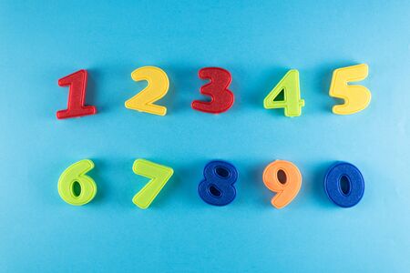 group of numbers from plastic toy against blue background. concept of learning to count for children and mathematical numerals