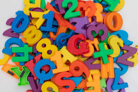 Colorful plastic numbers scattered on white background.