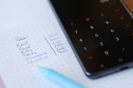 Monthly expenses are written on piece of paper with calculator. Family budget planning concept
