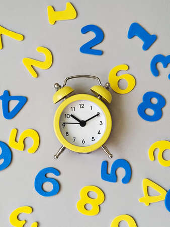 Illuminated yellow alarm clock on ultimate gray background with blue and yellow numbers flat lay