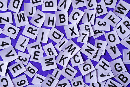 Letters and numbers on a purple trendy background as an idea for education and language learning information of typography and school fonts.