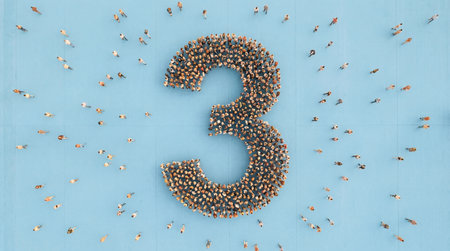 Organized human mass creates huge number three symbol viewed from above. Depicts census demographic data or countdown.