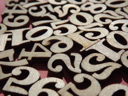 wooden numbers are randomly arranged on pink suede. High quality photo