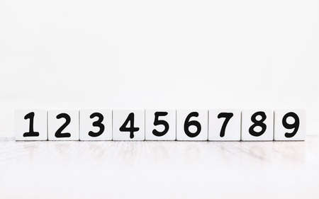Ascending order numbers, black typeface on white cube with reflection on wood table surface. Finance, strategy economy, education concept, set of permute number on white background with copy space.