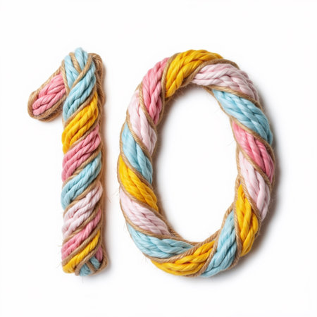 The number 10 is made from colorful rope on a white background, a birthday illustration.