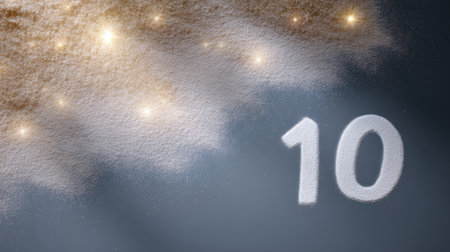 A closeup of number 10 painted in white powder against dark background, with soft glow and sparkling effects, creating magical and whimsical atmosphere