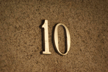 Weathered number ten on textured gray and white wall.