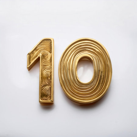 A golden number ten design featuring spiral engravings stands out against a plain white background, highlighting its artistic elegance.
