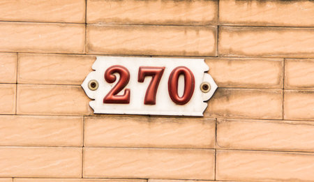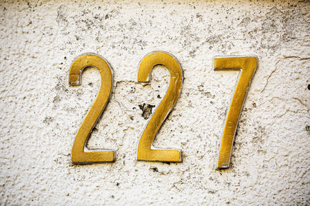 Golden house number 227 mounted on a rough, weathered white wall with peeling paint and visible texture. Aged surface and elegant metallic digits. Urban address or building ID concept