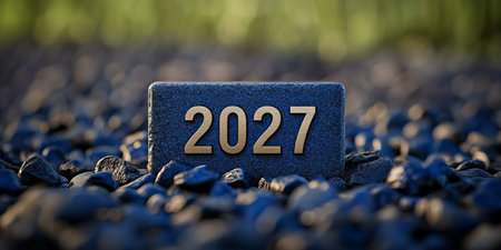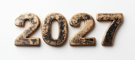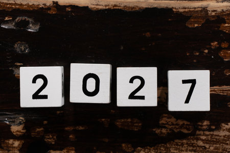 White cubes with black numbers lined up in a row symbolize the year 2027 and lie on an old wooden table outdoors