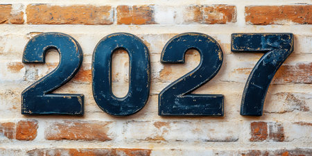 Rustic Metal Numbers 2027 on a Weathered Brick Wall with Vintage Style and Grunge Texture Elements