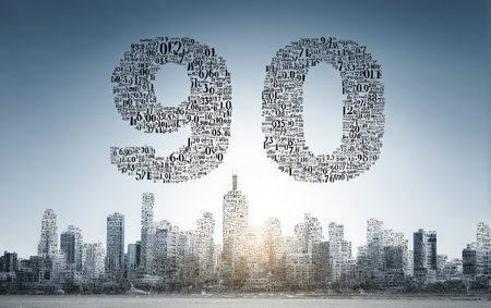 An image showcases the number ninety composed of numerous smaller numbers, positioned above a detailed cityscape. The scene is bathed in a soft light, suggesting either sunrise or sunset. The composition offers ample copy space and could be used in various commercial or editorial contexts.