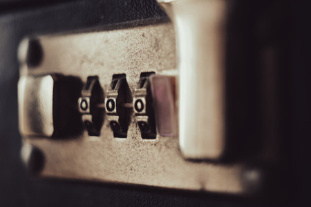 Close up of suitcase lock with security code on travel luggage, safety and protection concept for secure travel and baggage protection