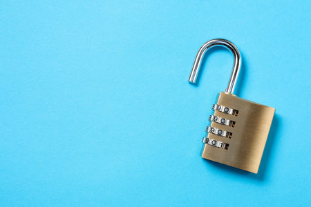 Close up numbered padlock over blue background. Vulnerability copy space concept