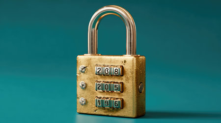 Close-up of a vintage gold combination lock against a turquoise background, showcasing its design and security features, ideal for themes of protection and privacy in the digital age.