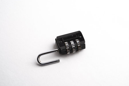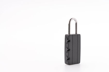 A black combination key lock placed on a white background. Ideal for concepts of security, password, protection, privacy, and safety equipment.