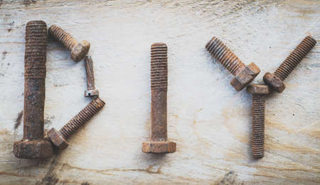 Word Bolt made of bolts.Wrench tool, old nuts and bolts of different sizes top view photo. Grey textured concrete background with copy space. Handyman tools close up picture.