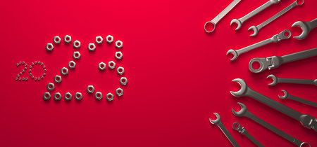 This image features a striking collection of shiny metallic parts and components creatively arranged against a bold red background, perfect for industrial themes.