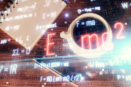 Double exposure of tech formula drawing and work table top veiw. concept of education.