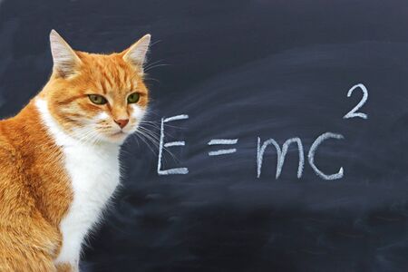 red tabby cat sitting in front of a blackboard with the Einstein formula and looking into camera