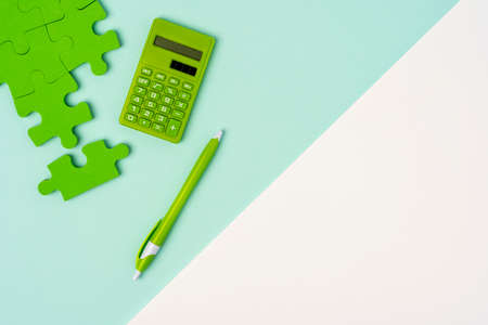 a successfully folding puzzle, a green calculator and a ballpoint pen